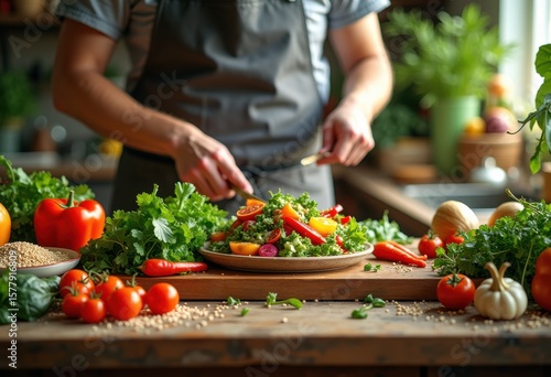 vibrant colorful plant based meal preparation fresh ingredients healthy cooking wooden board table, vegetable, artistry, salad, bowl, greens, herbs, seasoning