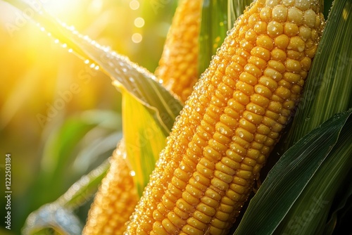 Vibrant corn on the cob glistening with dew in a sunlit field during early morning hours in a rural setting