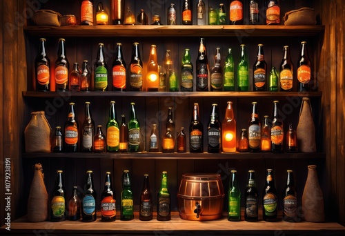 vibrant craft beer bottles displayed rustic wooden brewery table surrounded fresh ingredients brewing equipment, ale, amber, artisan, barrel, craftsmanship