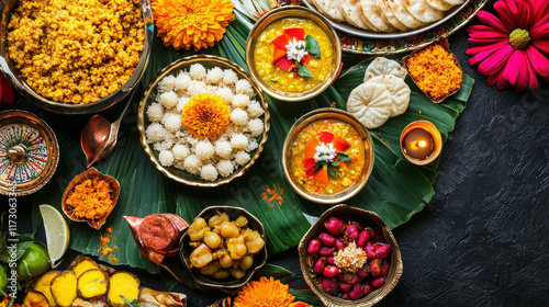 vibrant, festive, indian, feast, dish, celebration, tradition, colourful, food, epicure, culture, festival, vegetarian, meal, party, spice, sweet, savoury, platter, ingredient, herb, presentation, aromatic, local, cookery, offering, seasonal, family, gathering, ritual, variety, serving, fresh, hand-made, authentic, texture, favor, decorative, leaf, flower, warm, inviting, communal, indulgent, rich