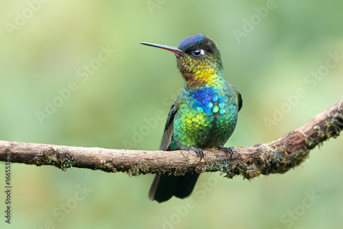 Vibrant Fiery-Throated Hummingbird on Tree Branch in Tropical Forest