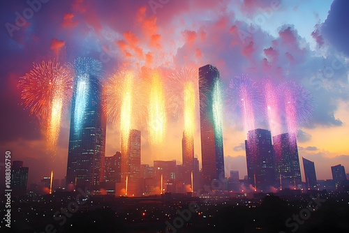 fireworks, city, skyline, night, dusk, colourful, celebration, urban, modern, building, skyscraper, light, spectacle, display, summer, festival, holiday, event, evening, glow, bright, vibrant, majestic, spectacular, amazing, beautiful, scene, view, background, image, illustration, graphic, design, texture, pattern, abstract, art, photo, illumination, architecture, metropolis, city landscape, twilight, dramatic, tower block, tower