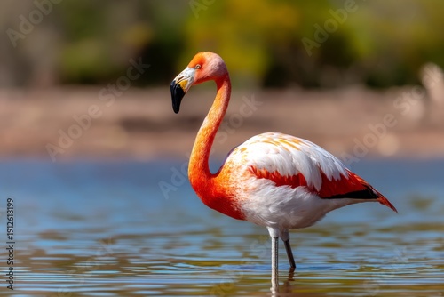 Vibrant Flamingo Standing Still in Shallow Lake During Tranquil Moment