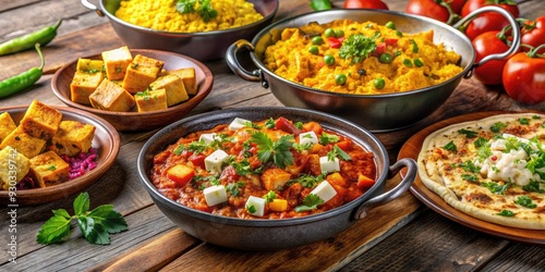 Vibrant, flavorful Indian dishes showcas-ing rich textures and colors, featuring savory Paneer Bhurjee, fluffy Cheese Omelet, smoky Paneer Tikka, and spicy Misal, appealing to food lovers.