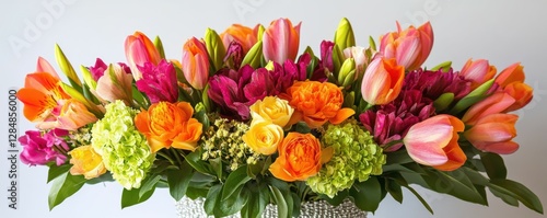 Vibrant floral arrangement with tulips and roses in decorative vase against white background