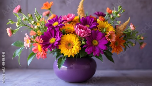 Vibrant Floral Composition, Colorful Flower Arrangement in a Purple Vase - Stunning Spring Bouquet