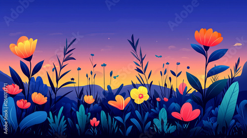 sunset, flower, plant, landscape, nature, floral, blossom, bloom, spring, summer, garden, field, meadow, leaf, vibrant, colourful, illustration, design, background, art, graphic, image, beauty, calmness, serenity, peace, harmony, growth, life, bright, colours, flower petals, stem, silhouette, hill, horizon, sky, dusk, evening, romantic, idylli, whimsical, fantasy, magical, scene, view, banner