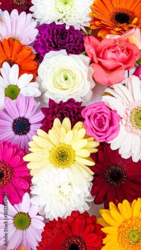 flower, floral, colourful, arrangement, spring, nature, bloom, blossom, garden, fresh, beauty, decorative, bright, vibrant, background, texture, closeup, gerbera, daisy, rose, ranunculus, chrysanthemum, magenta, orange, white, purple, yellow, red, pink, natural, blooming, view, artistic, flat, lay, top, summer, flora, botanical, many-coloured, festive, romantic, colours, beautiful