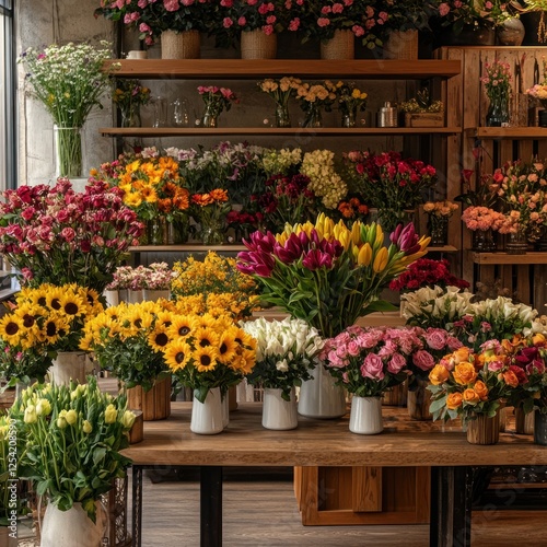 flower, shop, bouquet, rose, tulip, sunflower, floral, arrangement, display, colourful, vibrant, beautiful, blooming, flower petals, blossom, botany, nature, spring, summer, design, decor, fresh, beauty, elegance, romantic, wedding, gift, store, retail, business, market, stall, wooden, shelf, vase, table, interior, background, texture, bright, happy, cheerful, delightful, gorgeous, stunning