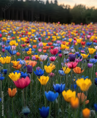 Vibrant flowers bloom in a lush green field surrounded by trees.