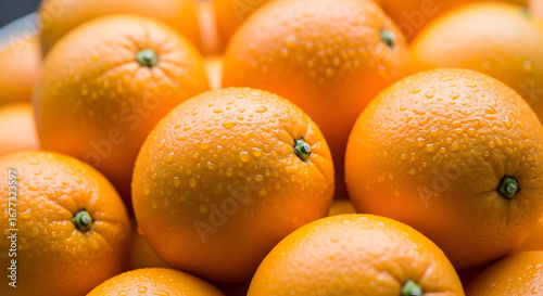 Vibrant fresh oranges piled close-up with water droplets — citrus fruit still life for food, grocery and healthy lifestyle visuals