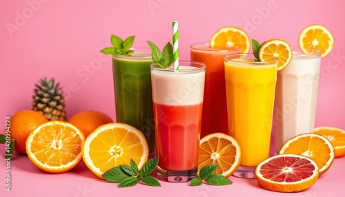Vibrant fruit smoothies & dairy drinks in colorful glasses on pink background, citrus accents, smoothie, fruit