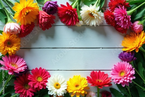 Vibrant Gerbera Daisies Create a Colorful Floral Frame on a White Wooden Background, Perfect for Spring or Summer Designs and Celebrations