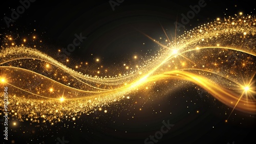Vibrant golden sparkle trail dust swirls in a mesmerizing wave pattern, radiating warmth and energy against a dark background, evoking a sense of luxury and dynamism.