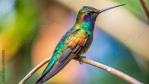 hummingbird, green, orange, bird, tree branch, perch, feather, beak, wing, iridescent, colourful, nature, wildlife, tropical, exotic, small, delicate, beauty, vibrant, fauna, animal, avian, flora, blur, background, closeup, macro, photo, wild, sharpened, shallow, depth, field, sharp, detail, pattern, texture, colours, hue