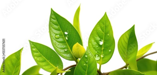 Vibrant green citrus leaves with glistening water droplets isolated on pure white background, essential oil, organic