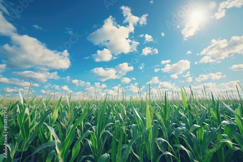 Vibrant green cornfield under a clear blue sky with scattered clouds and sunlight, showcasing natural agricultural beauty and growth.