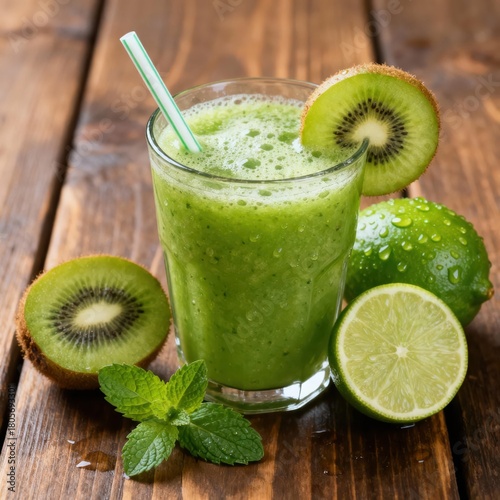 Vibrant green fruit smoothie presented with fresh ingredients on rustic wooden surface