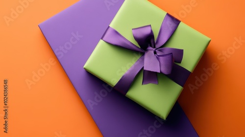 Vibrant green gift with purple ribbon on contrasting background