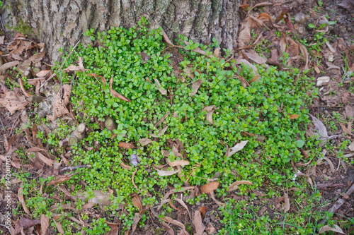 Vibrant green ground cover plants growing around the base of a large tree trunk