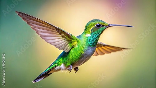 Vibrant green hummingbird in mid-flight, wings blurred, delicate feathers glistening, tiny beak extended, suspended in air against a soft, creamy white background.