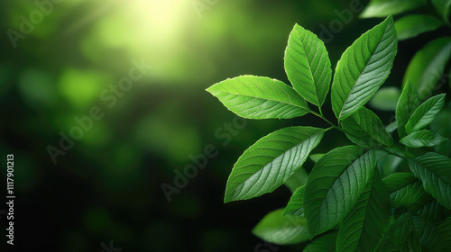 Vibrant green leaves illuminated by soft sunlight in a serene natural setting.