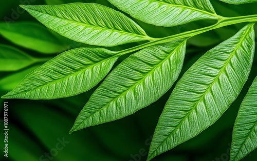 Vibrant green leaves showcasing intricate textures and patterns, isolated on a deep green background.