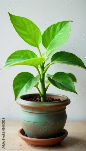 Vibrant green leaves sprout from a charming, rustic flowerpot, creating a lush and healthy indoor plant scene Perfect for spring, summer, and home decor themes , renewal, leaf, growth