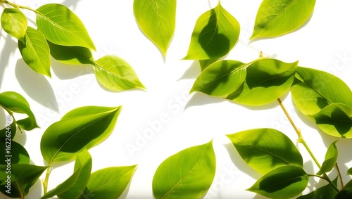 Vibrant Green Leaves with Soft Shadows on a Clean White Background.