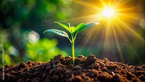 Vibrant green seedling bursts forth from dark earth, illuminated by soft morning sunlight, symbolizing hope, renewal, and the beauty of new life unfolding slowly.