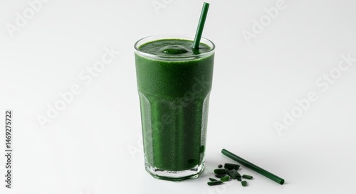 Vibrant Green Spirulina Smoothie in Glass with Straw on White Background