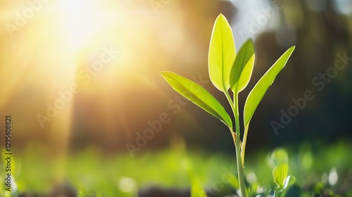 Vibrant green sprout emerging from the earth with sunlight in the background : Generative AI