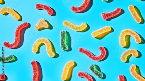 candy, gummy, colourful, sweet, treat, background, food photography, vibrant, colorful candy, jelly, dessert, sugar, confectionery, delicious, tasty, food, blue background, fruit candy, sweet food, sugar candy, topview, studio shot, bright, colourful, texture, pattern
