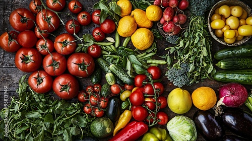 Vibrant Healthy Farm Meal Featuring Seasonal Fruits and Vegetables on Rustic Wooden Table