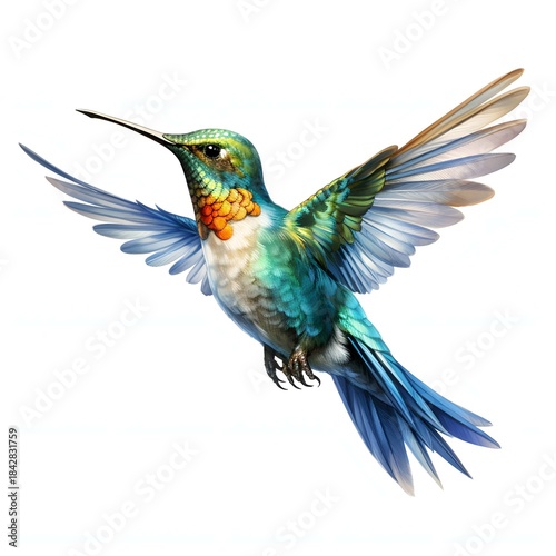 Vibrant hummingbird hovers mid-air with wings outstretched against a white background