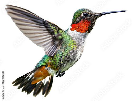 Vibrant hummingbird in mid-flight near flowers isolated on transparent background