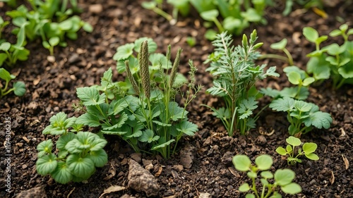 Vibrant intercropping of herbs and vegetables in permaculture garden, natural, balance