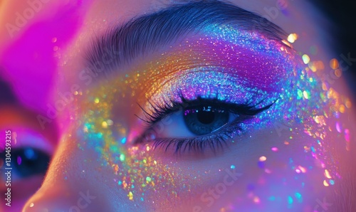 Vibrant makeup portrait with glowing neon eyeshadow, intricate glitter patterns, and radiant skin.
