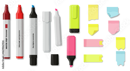 marker, sticky, note, stationery, highlighter, office, school, colours, bright, isolated, illustration, supply, writing, drawing, design, education, pastel, paper, business, equipment, study, vector, reminder, message, colourful, creativity, set, graphic, tool, element, art, yellow, pink, blue, green, red, white, nobody, texture, pattern, flat, style