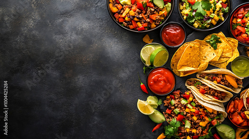 Vibrant Mexican Feast with Tacos and Salsa from Above