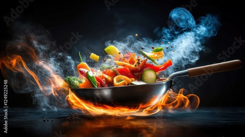 Vibrant Mixed Vegetables Stir-Fried with Flames and Smoke Effects
