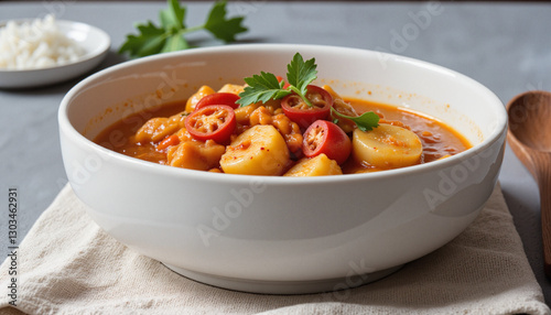 Vibrant moqueca presented in a deep ceramic bowl with fresh herbs, culinary delight