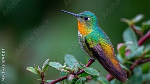 Vibrant multicolored hummingbird perched on leafy branch against soft green background
