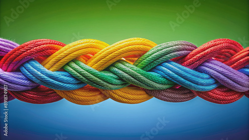 Vibrant multicolored ropes intertwined in a strong braid, symbolizing diverse team strength, unity, and partnership, set against a soft, gradient background, representing cooperation and empowerment.