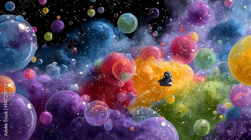 Vibrant nebula scene with rainbow hues and floating bubbles in cosmic atmosphere