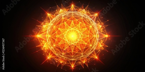 Vibrant orange hue radiates from a geometric shape amidst a dark canvas