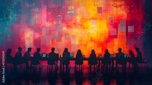 Vibrant Paper Cut of a Team Brainstorming Around a Conference Table with Sticky Notes and Tech Devices