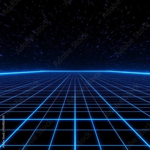 Vibrant photo of retro 80s video game background with grid of blue light streaking in space.