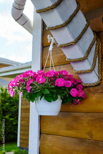 pink, flower, hanging, pot, wooden, exterior, rustic, decor, gardening, vibrant, floral, design, home, wall, summer, plant, greenery, nature, blossom, inspiration, bright, decoration, container, petunia, carpenter's shop, handcraft, landscape, backyard, rope, detailed, house, bricolage, ornamental, bloom, seasonal, charming, woodwork, craftsmanship, lush, botanical, fresh, high-coloured, verdant, planted