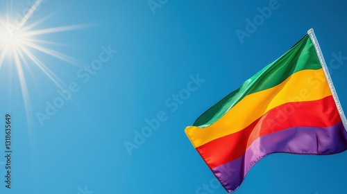 Vibrant Pride Flag Waving Energetically Against Clear Blue Sky Under Radiant Sunlight